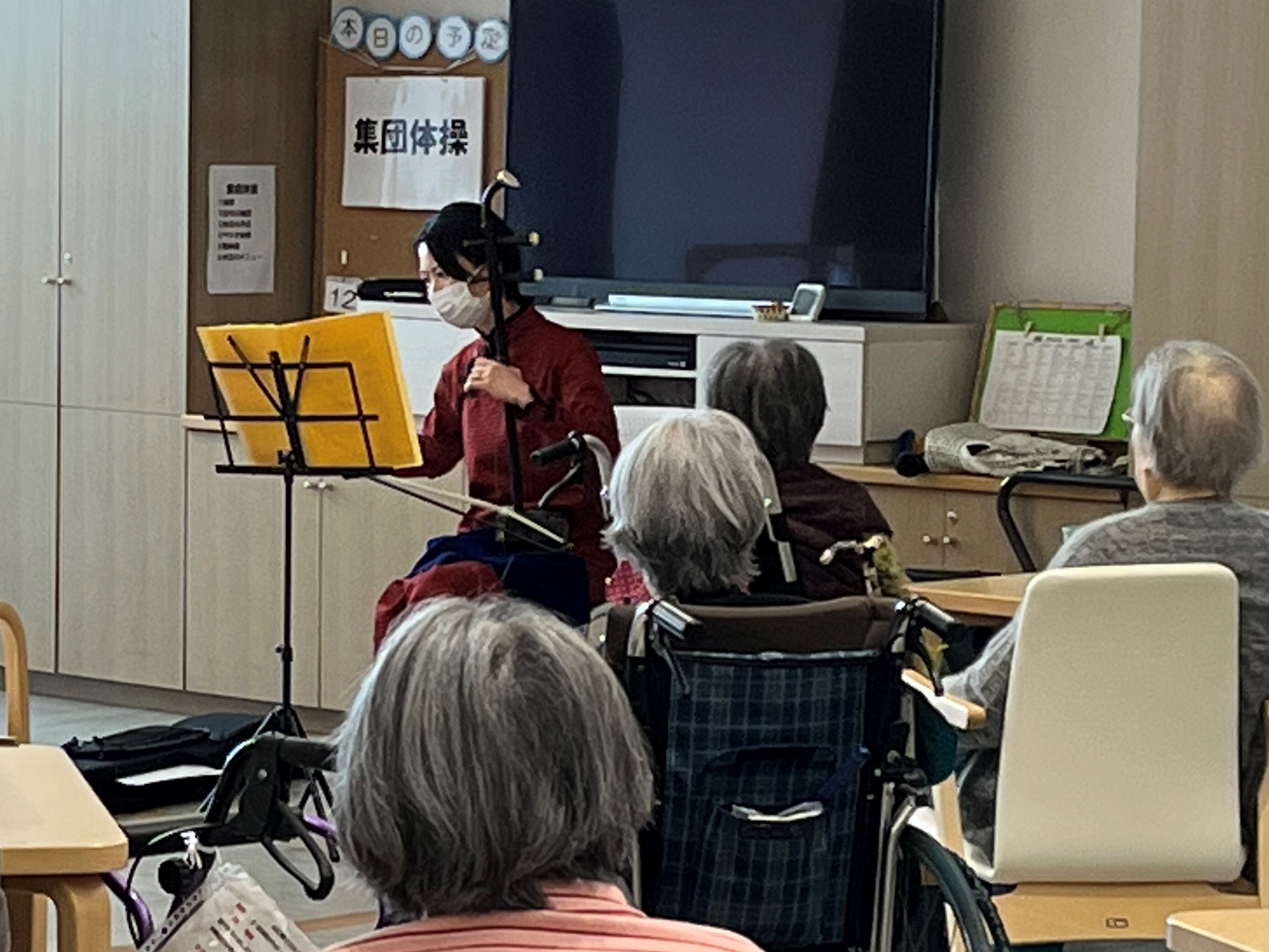 初めて楽器を見た方や聞いた方がほとんどでしたが、荒城の月や出船、テネシー・ワルツ、クリスマスソング、中国の曲を披露して頂き、演奏に合わせて口ずさんでいました。