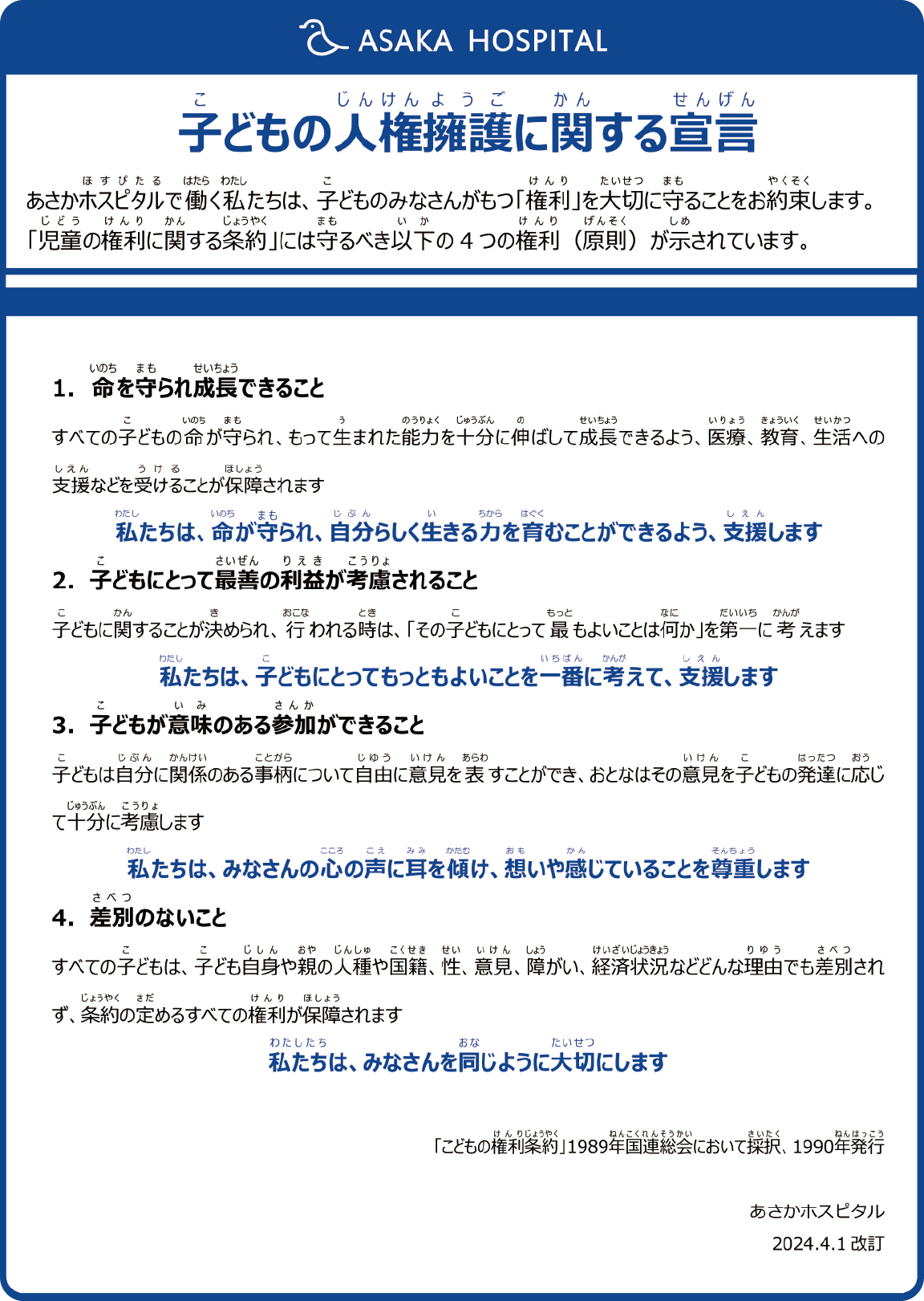 私たちは、こどもとそのご家族、一人ひとりの感じることに寄り添い、手を差し伸べることを大事にします。そして、思いやりにあふれたゴールをめざし、皆さまが安心して医療・保健・福祉を受けられる場を作っていきます。