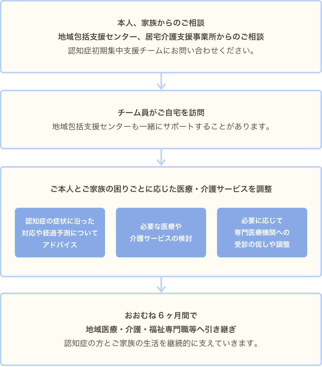 認知症になっても本人の意志が尊重され、できるかぎり住み慣れた地域の良い環境で暮らし続けるために、認知症の不安がある方やご家族に早期に関わり、医療・福祉につなぐ支援を初期段階(おおむね6ヶ月)で行い、自立生活のサポートを行います。