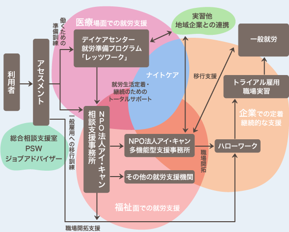 人は仕事をすることで収入を得て生計を保ち、仕事役割の遂行を通して自分の社会的存在や価値を確認することが出来ます。しかし、障害がある人にとって、それをあたり前に実現することが出来ず、夢やあきらめの域にとどまってしまいます。あさかホスピタルグループでは、障害があっても働けることを実現するため、あさかホスピタル、NPO法人アイ・キャン(以下アイ・キャン)が経過やニーズにあわせたプログラムを提供し、ハローワークや就業・生活支援センター、また地域企業の協力を得て障害者就労支援を行っています。