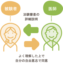 | 説明 | 治験の目的や治験薬の特徴、治験の実施方法などが記載した同意説明文書をもとに、医師が参加を希望される方に説明を行います。 |