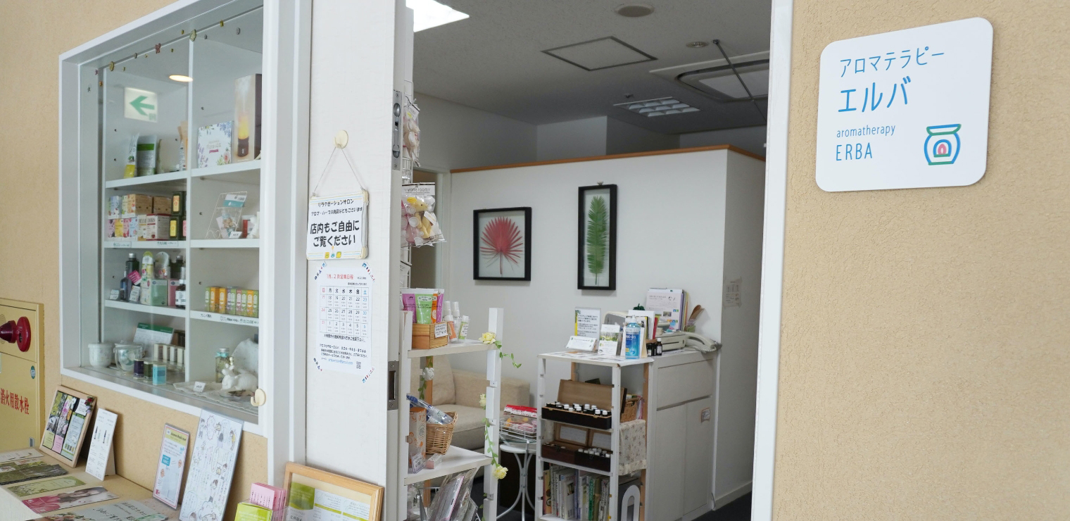 アロマテラピーエルバの店内は、心に優しい音楽と爽やかな香りで、癒される空間となっております。落ち着いた空間で行うアロマトリートメントは、優しい香りが全身を包み、心身共にリラックスすることができます。英国式リフレクソロジーは、心地よく足裏を刺激することで、内臓機能に活力を与え元気を充電してくれます。
